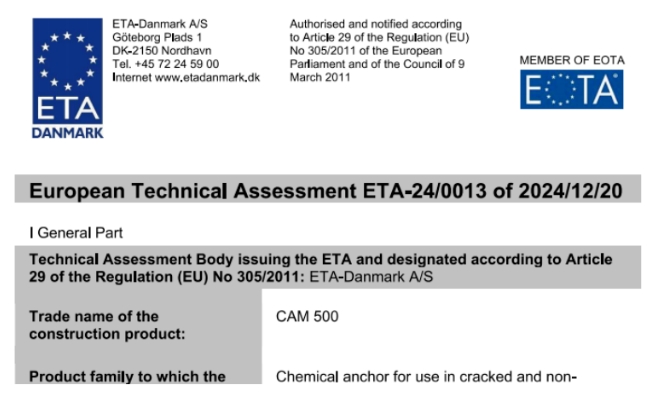 近日,快猫短视频在线观看繼擴底錨栓後,化學錨栓也順利通過了ETA認證,並獲得認證證書。